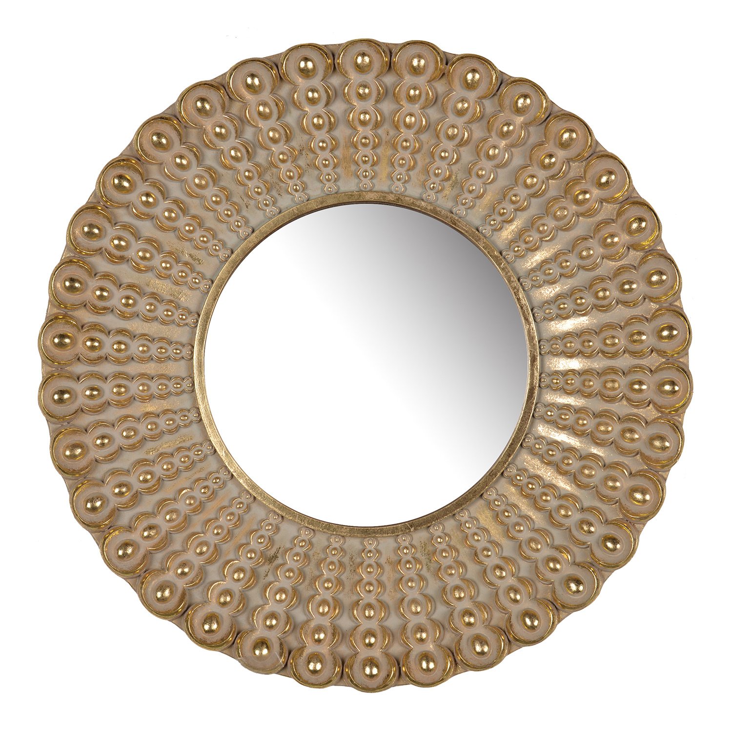 With its gleaming gold hue and radiant beaded sunburst design, this round decorative mirror draws inspiration from alluring artworks to create a unique, sophisticated statement piece. Measuring 18.5H x 2.5D x 18.5W, this mirror will thrive as a warm centerpiece in any room in your home, with the lustrous colorway adapting to complement a wide variety of interior styles.