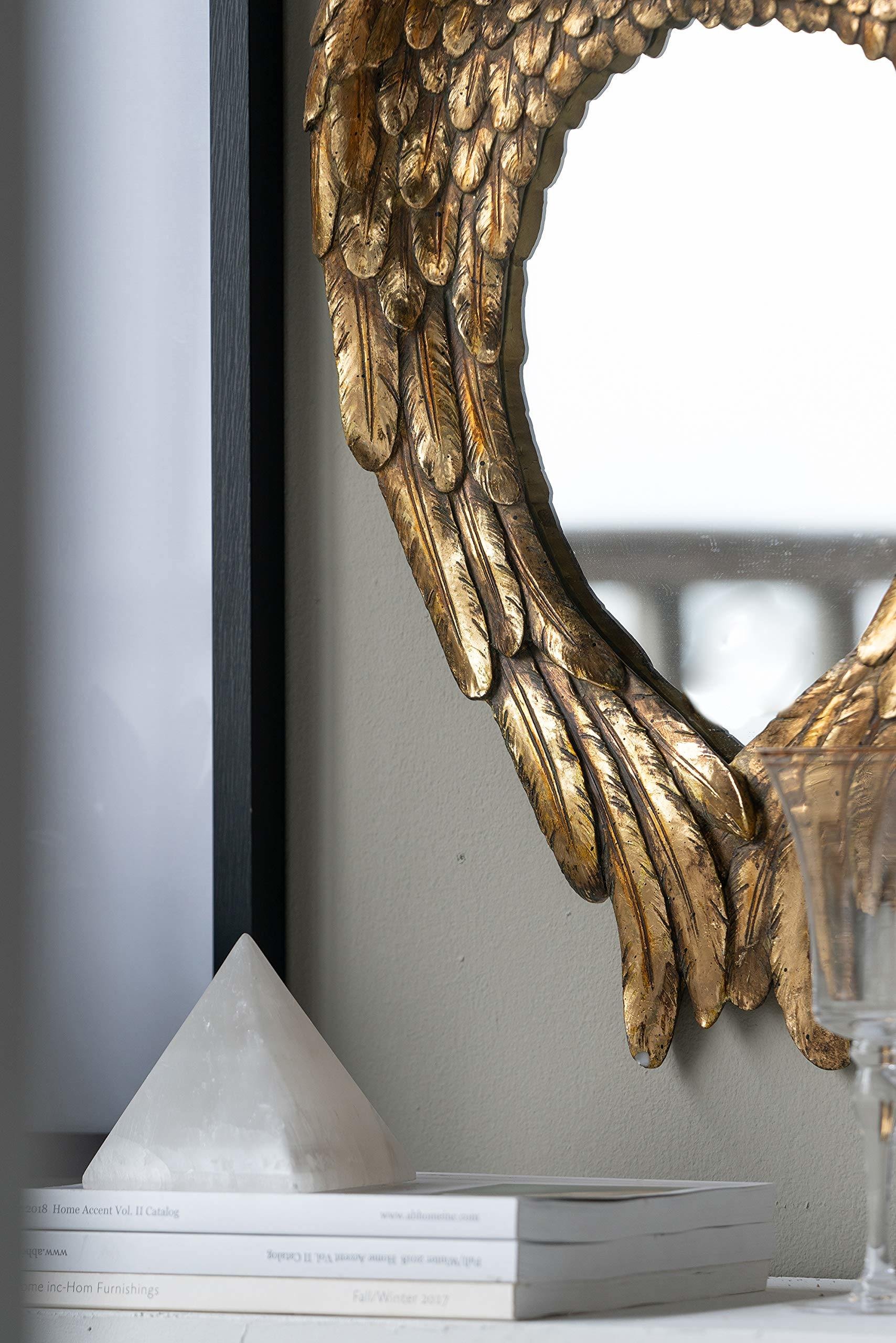 Distinctive style meets versatility with this contemporary accent mirror. Boasting a gleaming gold hue and a captivating heart-shaped wing silhouette, this piece has been crafted from 100% resin to achieve the most detailed features across the feathers. Measuring 22.5H x 16W x 2.5D, this mirror is the perfect focal point for any room throughout your home and office.