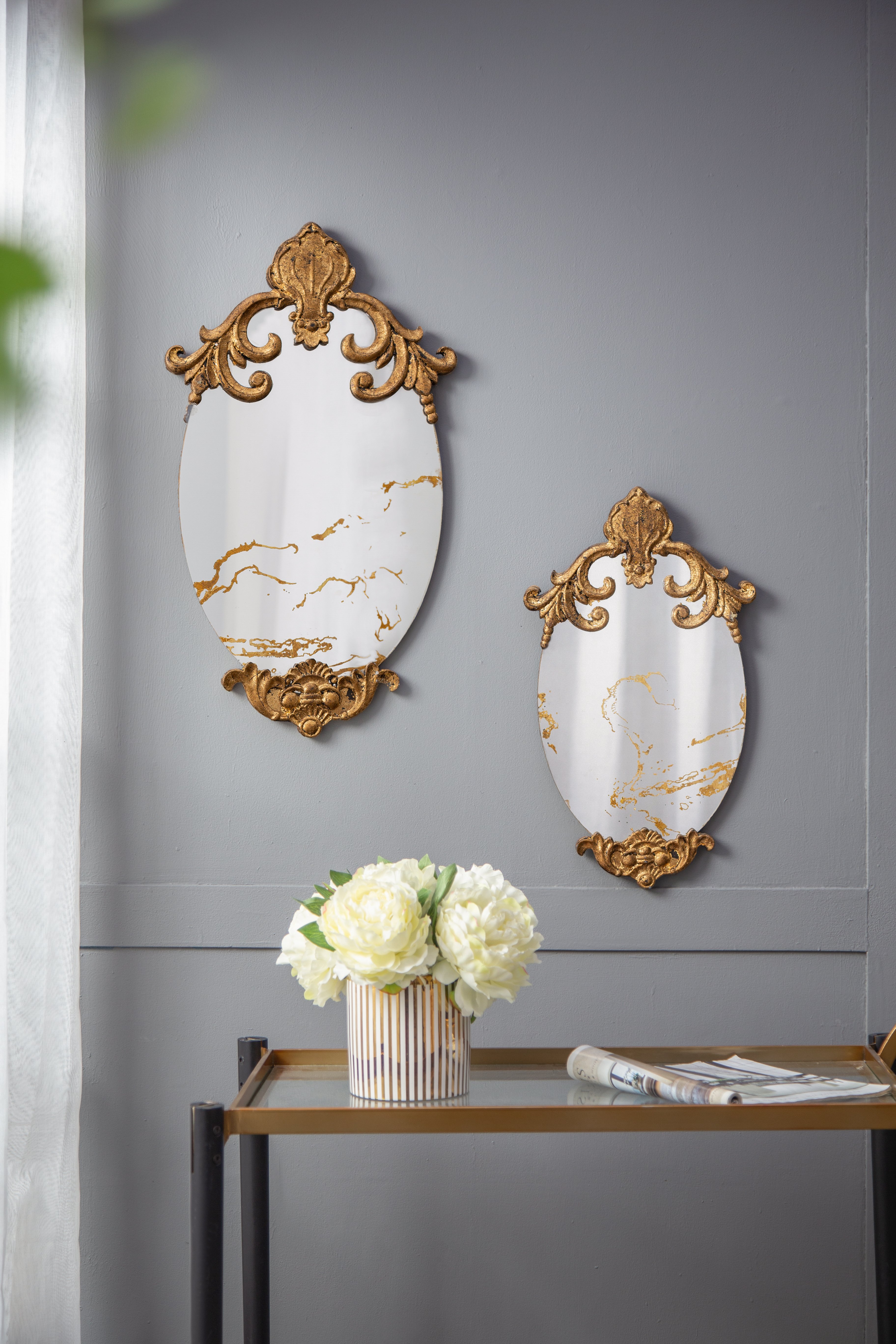 With its oval silhouette, antique gold colorway, and alluring scrollwork design, this decorative accent mirror is sure to embellish your home decor. The resin frame allows for such rich details to be possible, while the MDF backing infuses this piece with a durable yet lightweight touch. Measuring 26H x 15W,this mirror is the perfect size to add a layer of regal whimsy to any room in your home.