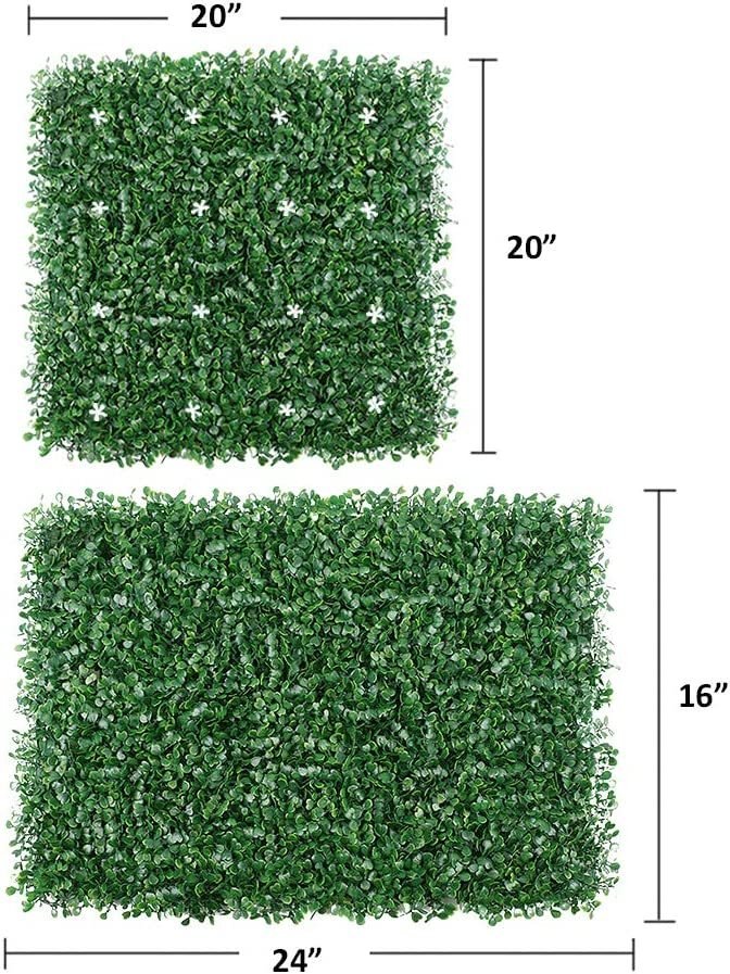 1.FULL BRANCHES & LEAVES: 6 Pack Artificial Plants Wall Boxwood Hedge Mats. Each mat size 20'' x 20'', come with 468 pieces plants on each panels, realisstic appearance through leaves.