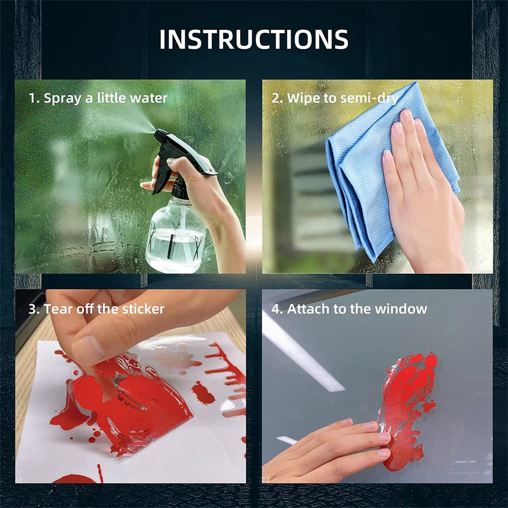 2.Waterproof & Easy Application: Crafted from waterproof PVC material, these self-adhesive stickers are both reusable and easy to peel off. They won't stain surfaces, making them ideal for windows and glass doors. Their versatile design, featuring splashes, drops, and prints, adds an eerie touch to any smooth surface.