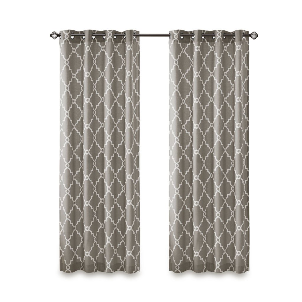 The Madison Park Saratoga Fret Print Panel is the perfect addition for a casual and stylish update to your home decor. This window panel features a trendy soft beige fretwork on a light grey ground, creating a simple yet modern look. The cotton blend basket weave fabric softly filters the perfect amount of sunlight into your home, while providing texture for natural appeal. Gunmetal grommet top detail makes this panel easy to hang, open, and close throughout the day. Fits up to a 1.25" diameter rod. Pattern position may vary per panel due to random cutting of fabric.