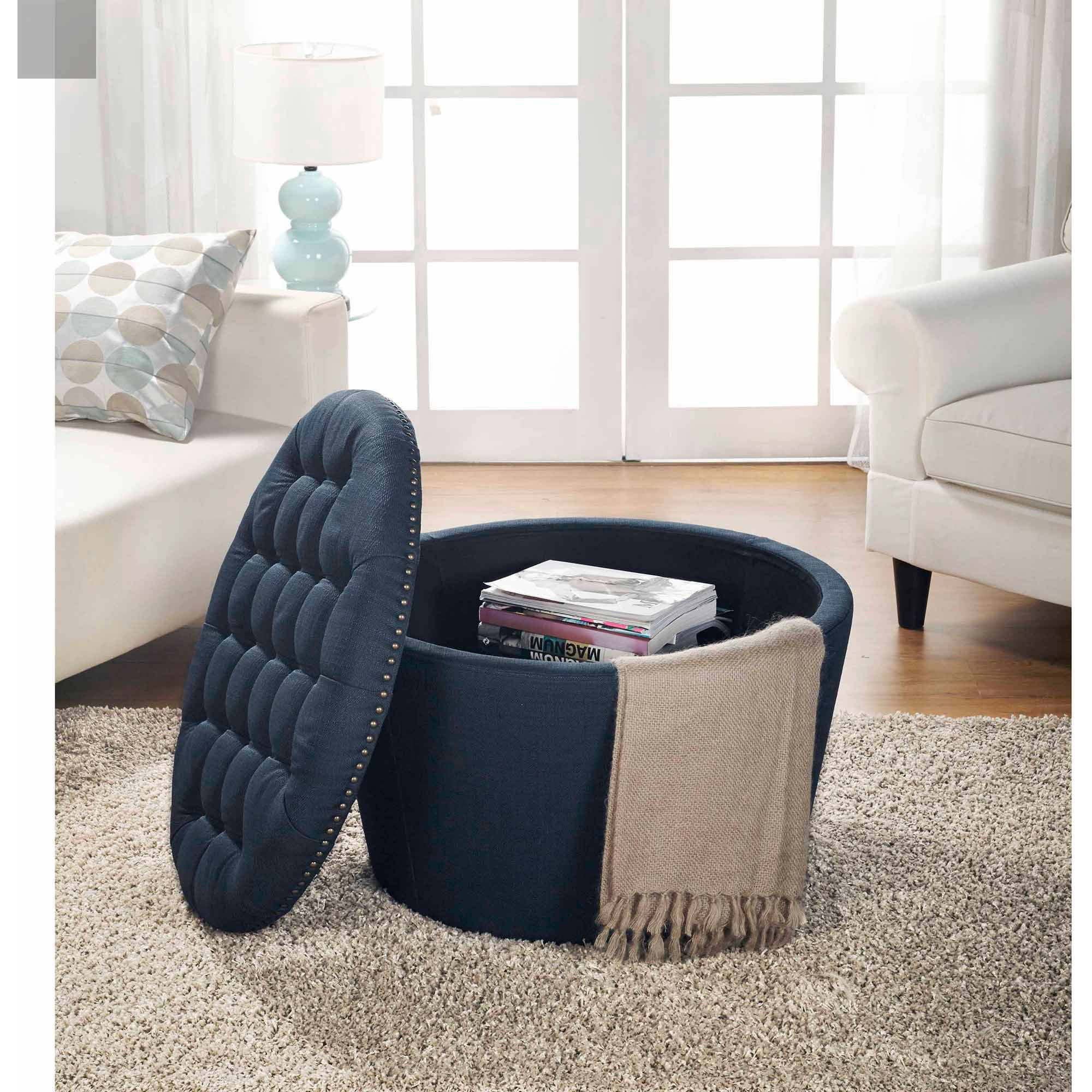 Add some versatile style to your space with the Round Tufted Storage Ottoman (with Nail heads). It has a sturdy frame made of high-quality materials for extended use. This blue round ottoman features a tapered base and a chic thickly padded top wrapped in lovely linen upholstery with a tufted exterior. It also includes decorative nail head detailing around the edges of the removable lid for added appeal. Plus, it's more than just an eye-catching accent piece. Remove the top and inside is a spacious interior well suited for storing extra pillows, linens and more. Use this lovely piece as an additional seat for guests, as a high-end footrest, offering long-lasting comfort or put glass or any flat lining on top of it and it instantly transforms into a table. It's available in multiple colors to complement your existing decor. It's suitable for use in a living room, a bedroom or a home office.