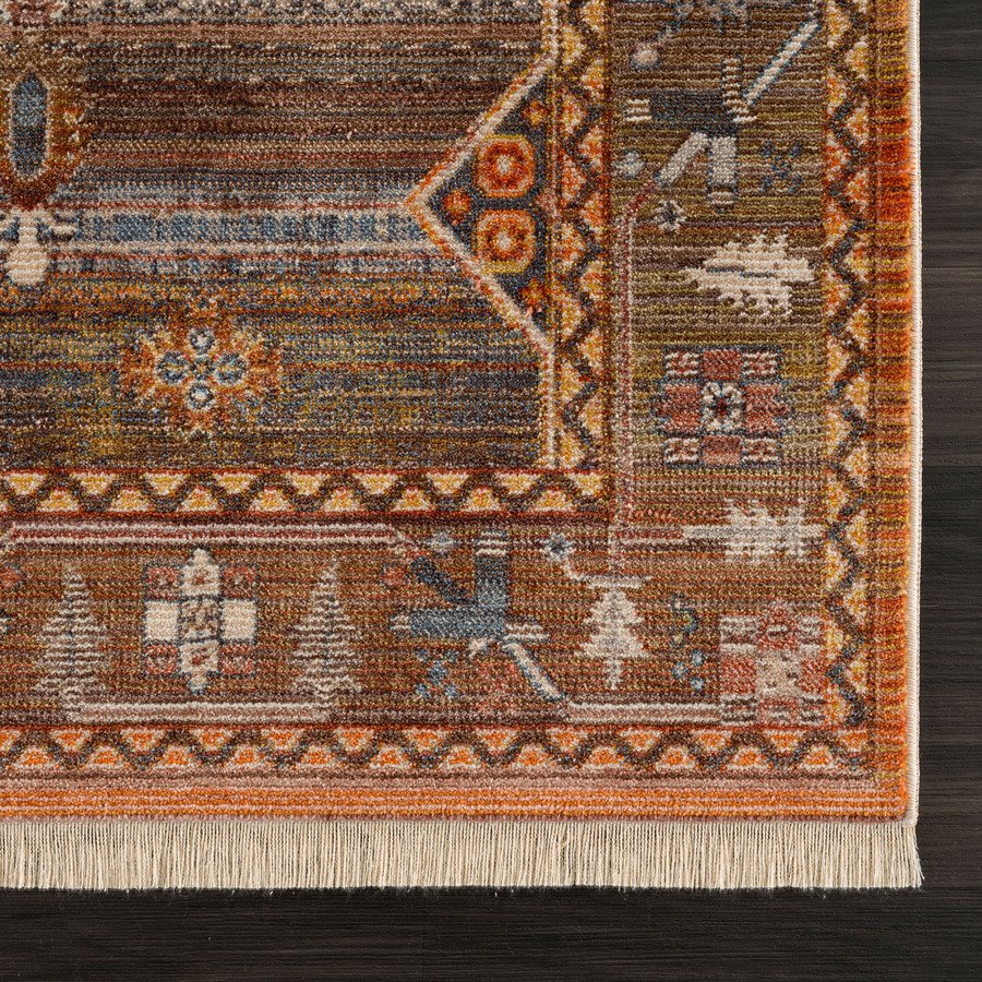 The distressed display of desert hues in brown, yellow, orange, and blue gives this area rug a rustic boho-chic appeal.