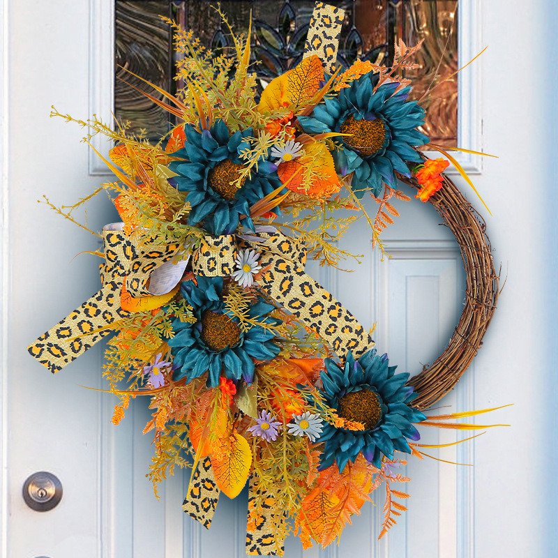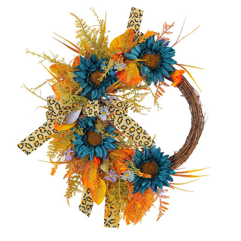 Home > Thanksgiving Blue Sunflower Wreath Patio Leopard Ribbon Deadwood Door Hanging Decoration Simulated Flower Rattan Wreath Wall Hanging