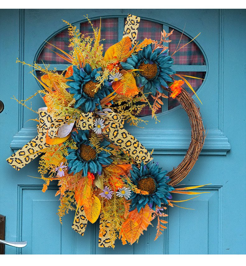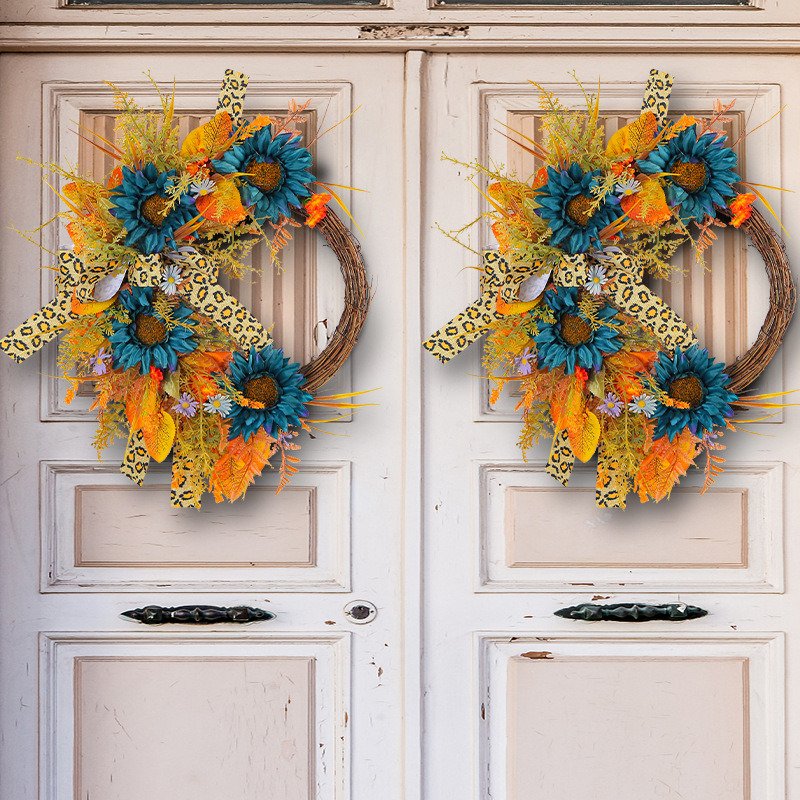 Thanksgiving Blue Sunflower Wreath Patio Leopard Ribbon Deadwood Door Hanging Decoration Simulated Flower Rattan Wreath Wall Hanging